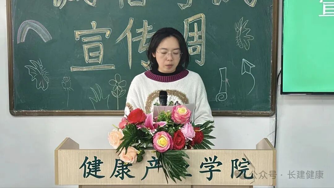 24级辅导员姜婷婷宣读《诚信考试宣传周实施方案》,本次诚信考试宣传周活动向全体同学发出诚挚倡议,号召大家主动参与各项活动,让诚信考试的理念根植于心、外化于行,共同营造风清气正的校园考试环境。