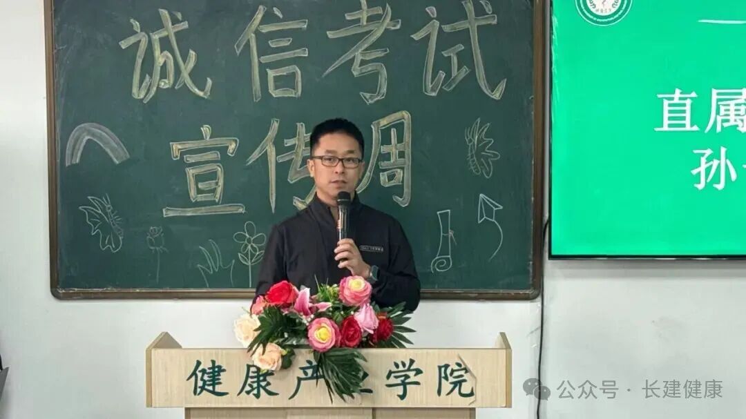 直属党支部书记孙一平强调,同学们作为健康产业学院学子,未来职业关乎人民生命健康,诚信是健康行业立身之本。当前英语四六级考试与期末考试临近,考场诚信不是单纯纪律要求,而是职业诚信的起点,考场上投机取巧,未来难守医德、护佑患者,这是对职业初心的提前考验。他同时要求同学们正视考试,杜绝作弊念头,严守考场纪律、维护学籍信誉,将诚信融入日常学习、实训及未来实习,争做健康行业诚信先行者。