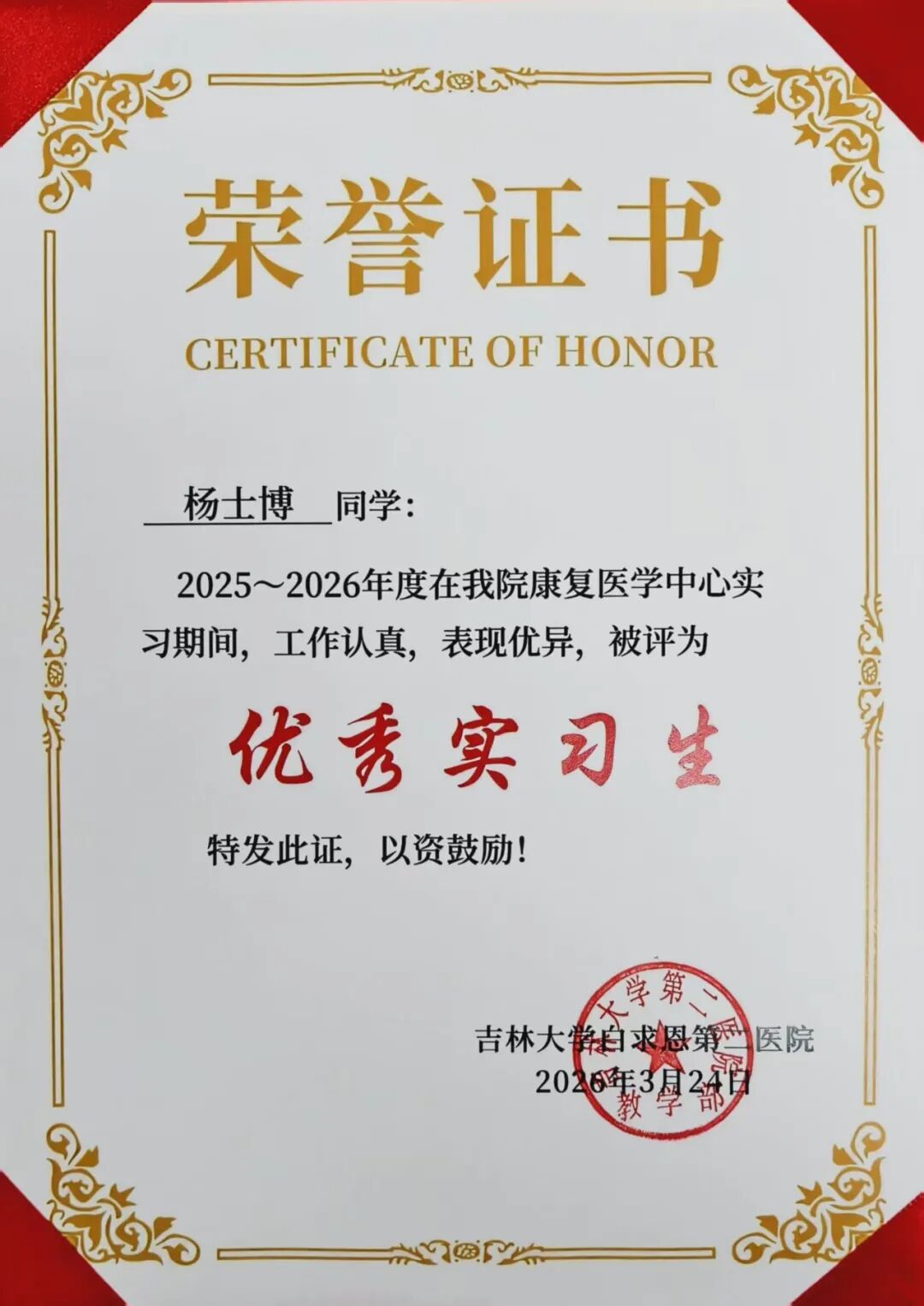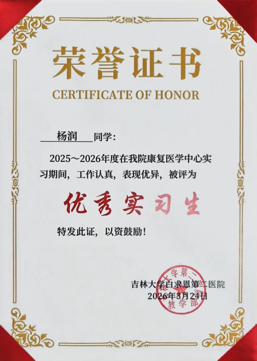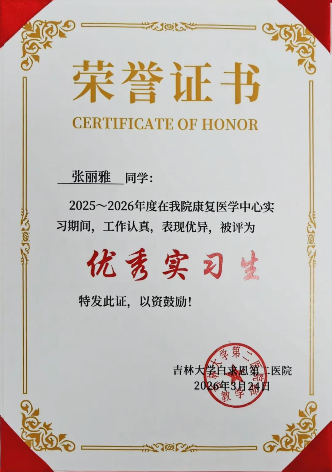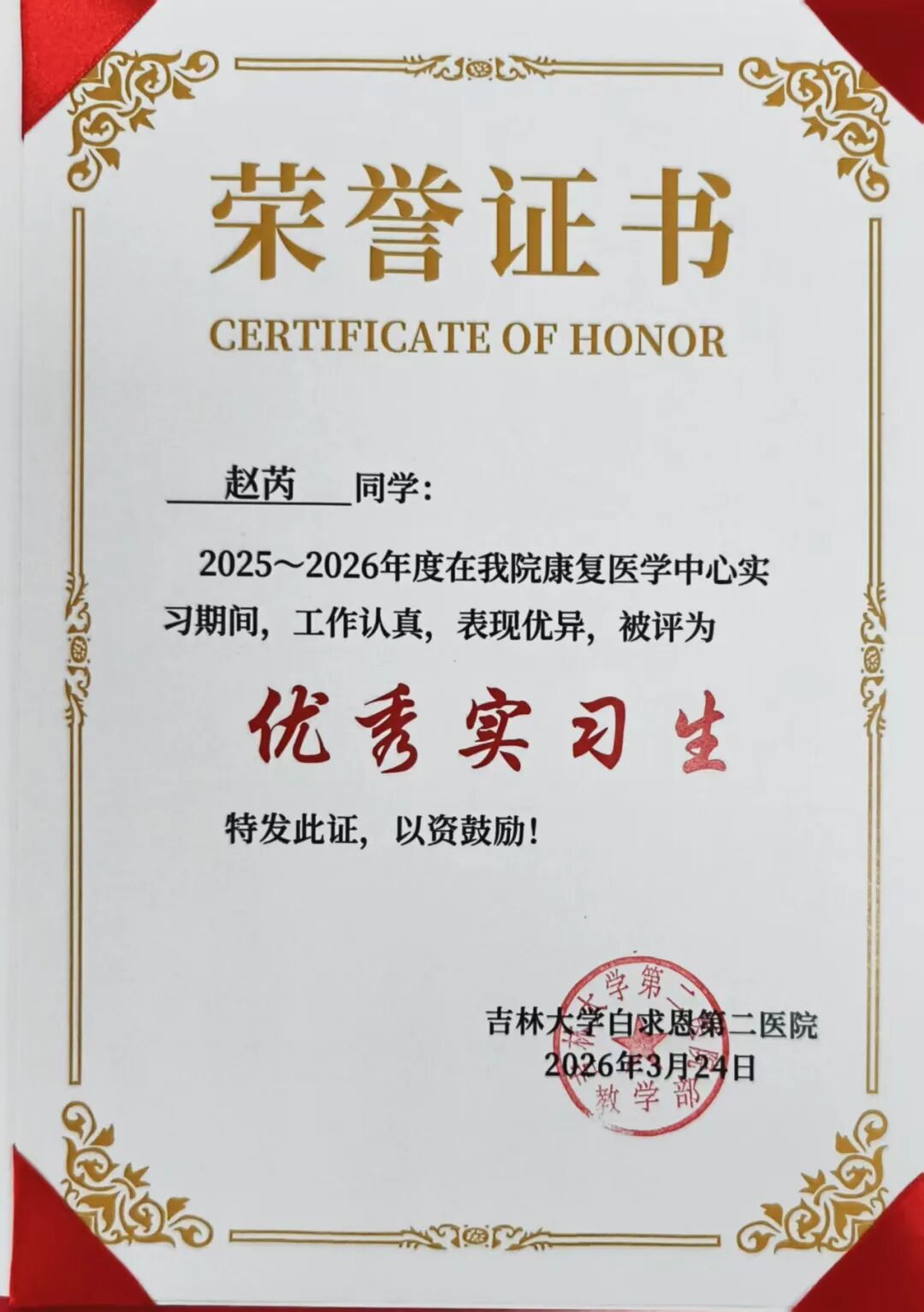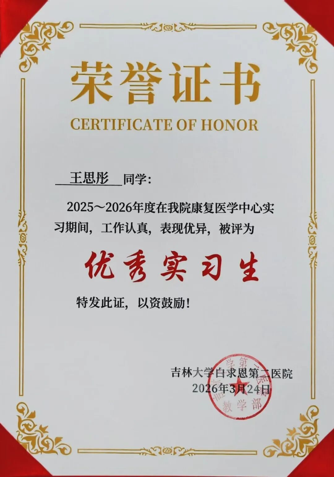 喜报||健康产业学院7名学子在吉林大学白求恩第二医院康复医学科2025-2026学年实习阶段荣获“优秀实习生”称号